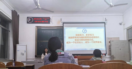 随后,班会通过一项关于老员工压力困扰的调研结果导入,引导同学们认识到有效沟通和化解冲突的能力是更好适应老员工活的必要技能。主讲人通过案例分析,帮助同学们理解梅拉比安沟通模型和萨提亚沟通圆理论,通过情景设置和现场互动,引导同学们分析所听所看,厘清感受需求,清楚表达请求。