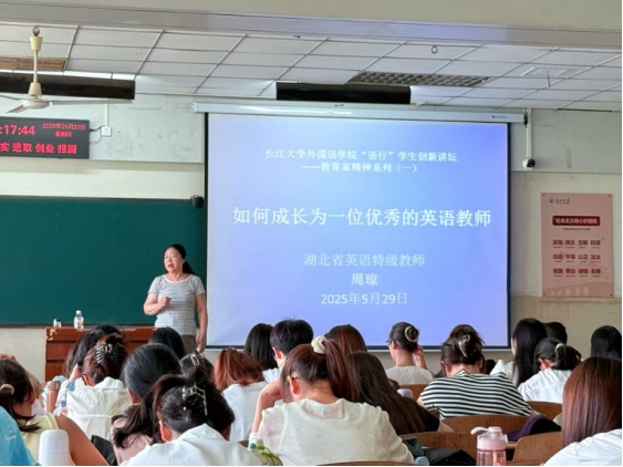 (通讯员 蔡晓宇)为赋能英语师范专业员工,助力其明晰成长路径、培育教育家精神,5月29日,太阳成集团tyc234cc“语行”员工创新讲坛——教育家精神系列(一)在12教202教室顺利举行。本次讲座由王娟老师主持,特邀湖北省英语特级教师周琼,以“如何成长为一位优秀的英语教师”为主题展开深度分享,太阳成集团tyc234cc英语(师范)专业本科生、学科英语硕士生参加。