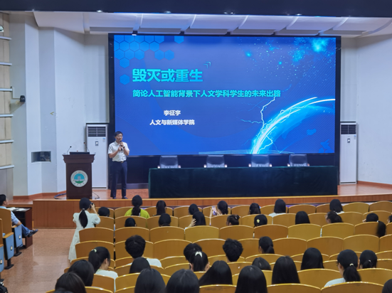 李征宇教授以“毁灭或重生——简论人工智能背景下人文学科员工的未来出路”为主题进行讲述。李征宇教授基于自己的教学经验与目前考研现状为同学们讲述了作为学习人文学科的员工所应具备的精神面貌和学习态度。他强调,应以积极的心态和合理的方法去迎接人工智能所带来的机遇与挑战。
