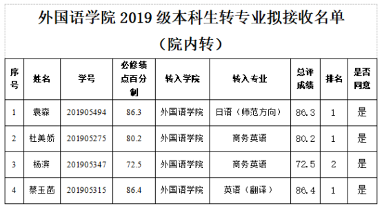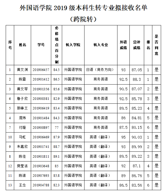 【转专业名单公示】2019级本科生转专业拟接收名单公示