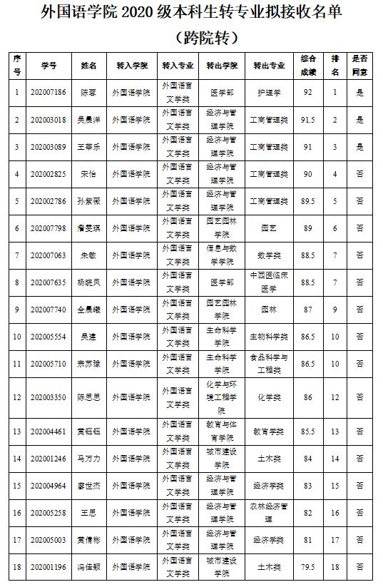 【转专业公示】2020级本科生春季学期转专业拟接收名单公示