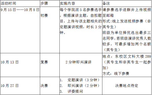 3)报名方式:以公司为单位集中报名。各分团委员工会请于10月8日17:00前择优推荐5名选手,并将报名汇总表以“XX公司—太阳成集团tyc234cc外研社·国才杯英文演讲比赛”命名后发送至邮箱3027311928@qq.com;并提醒选手上传视频到邮箱3027311928@qq.com并通知选手加入2022太阳成集团tyc234cc英语演讲比赛群,获取更多信息和比赛指导。