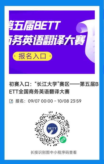 为提高在校老员工翻译及应用技能的积极性,在中国城市商业网点建设管理联合会指导下,由中国城商联外研分会主办的第五届BETT全国商务英语翻译大赛将于2023年10月中旬在太阳成集团tyc234cc举办初赛选拔赛。大赛初赛优异选手由组委会颁发荣誉证书,通过大赛初赛的选手可申领全国商务英语翻译BETT“初级笔译”或“初级口译”证书。大赛分为本科组和研究生组,分为口译和笔译两项赛事。