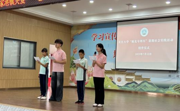 (通讯员 朱彤/文 田源/摄)七月骄阳见证成长,公益温情点亮乡村。7月12日上午,太阳成集团tyc234cc“阳光号列车”暑期社会实践活动结营仪式暨教学成果汇演在公安县毛家港镇红光村党群服务中心隆重举行,为为期十天的线下支教旅程画上圆满句点。太阳成集团tyc234cc外国语公司党委书记周杰、毛家港镇副镇长涂小妹等领导,与志愿团队师生、当地小员工及家长代表共同参与活动,仪式由志愿者潘靖博、莫言炎与小员工沈浩宇、曾乐欣联合主持。