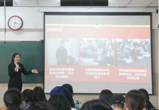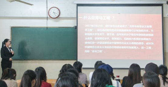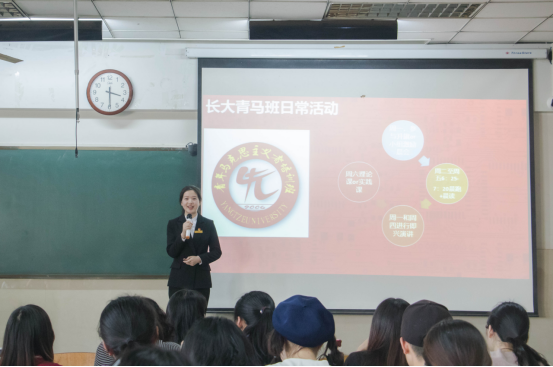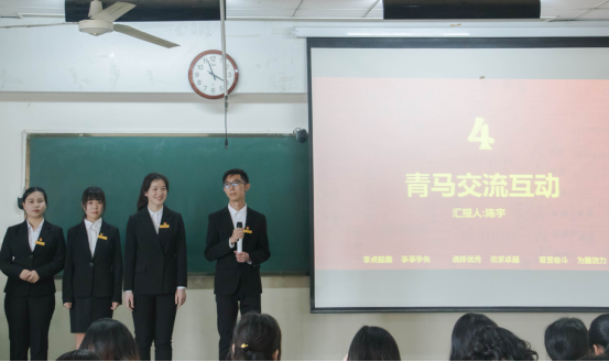 檀圆圆在会议开始就向大家介绍了什么是青马工程,青马工程的培养对象、培养内容等,同时还向同学们介绍了青马班的历史。听完讲解后,许多同学都表示了对青马班的向往。随后,李梓雯从面试过程、培养体系、班级构架、班级运行、日常活动、班级特色活动等多个方面全方位地展示了学员的青马风貌。紧接着,王随讲述了自己进入青马班以来的心路历程。她向学弟学妹们展示了作为“三早”的维护者、践行者、受益者是如何在青马班准确自我定位,不忘初心,砥砺前行的。同时她倡导大家都应当积极响应“早起床、早自习、早锻炼”的口号,引起了台下观众的共鸣。最后,陈宇和同学们进行了交流互动,让同学们认识到青马班是有着丰富的活动和积极氛围的组织。同学们争相领取了团委主办的《浪尖》期刊,并且表达了自己对青马班的浓烈兴趣与想要进青马班的决心。