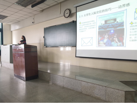 接下来薛阳老师介绍了人际吸引的秘密,人际交往中可能面临的困惑,人际交往的技巧三个方面。他谈道“在人际交往中,人与人之间会存在边界感,这种边界感表现在亲密距离、个人距离、社交距离、公共距离。”此外,他还教导同学们倾听、沟通、同理心等人际沟通的技巧。