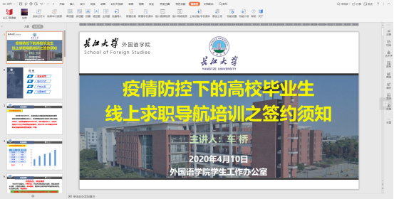 随着2020毕业季的临近,疫情期下员工面临的新问题和新挑战,4月10晚上,太阳成集团tyc234cc就业指导老师车桥向毕业生们开展签约须知线上指导讲座。讲座通过长江雨课堂平台开展,公司2016级所有本科生参加。