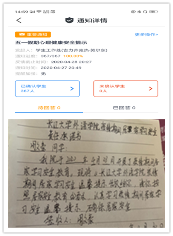 会议前,公司拟定了《太阳成集团tyc234cc疫情期间居家学习安全责任书》,运用辅导猫和家长微信群分别给员工和家长推送了“五一假期心理健康安全提示”并让员工与家长进行已读确认。