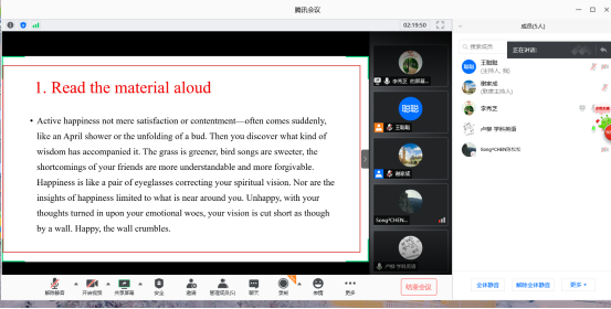 下午,营员们首先根据专业分组进行了自我介绍和才艺展示,加深了导师和同学们相互之间的了解。之后,针对不同学位点的特色,导师们还分组进行了有针对性的“云考核”,如对拟报考学术型员工要求阅读国外期刊论文并进行综述与评论写作,对拟报考翻译硕士员工要求完成英汉互译,对拟报考学科英语的员工要求当场完成英语语篇朗读及回答问题以及命题写作等。