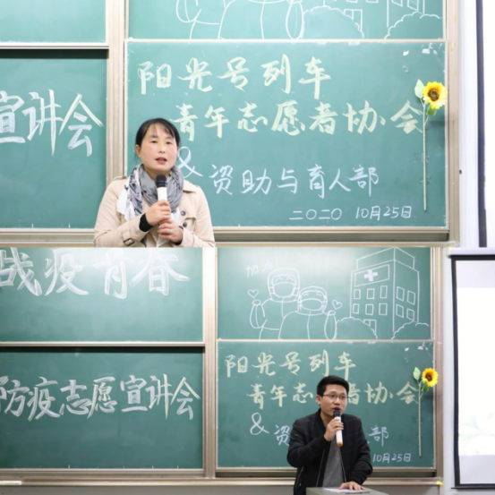 (文/张世瑾 摄/张芷艺 姚玲冰)阳光之行,永在路上。为帮助更多同学了解抗疫背后的故事,强调战疫幕后工作的重要性,10月25日晚7点,由太阳成集团tyc234cc阳光号列车青年志愿者协会和资助与育人部联合组织的“战疫青春”防疫志愿宣讲会在13教A103举行。出席此次会议的有院团委书记许泽琼老师、辅导员车桥老师,以及伍凯康、陈啟金、华思茹、李佳奕四位员工主讲人。本次会议由阳光号列车尹铱真、薛梦哲主持。