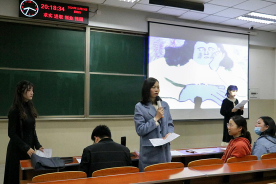 在上半场的比赛中我们看到了舞蹈、乐器、歌曲及英语话剧表演。由商英11802和11904班的两位选手带来的rap 作品《Tricky Trick》节奏感强、表现张力十足,一上场便点燃全场。英语12005班的趣味改编话剧作品《超级小红帽》幽默诙谐、内容丰富。观众欢笑不断,纷纷被大一新生的创造力与活力感染。在下半场比赛中我们看到了独舞、器乐合“唱”、诗朗诵和有趣的相声作品。由日语12002班带来的器乐合“唱”作品《凤凰于飞》余音袅袅,韵味十足。婉转的笛声与悠扬的歌声交织,给人以美的享受。英语12007班的诗朗诵作品《唐诗里的中国》队形整齐,选手们身着古装,用深情的朗诵将我们带回那个梦一般的时代。由商英11902班与英翻11902班的两位选手带了的相声作品《疫情中的故事》朴实含蓄、回味悠长。给观众带来了新的观感体验。最后杜老师就不同类别的作品根据其音准、节奏、舞台表现力、编剧效果对参数作品进行了逐一点评。