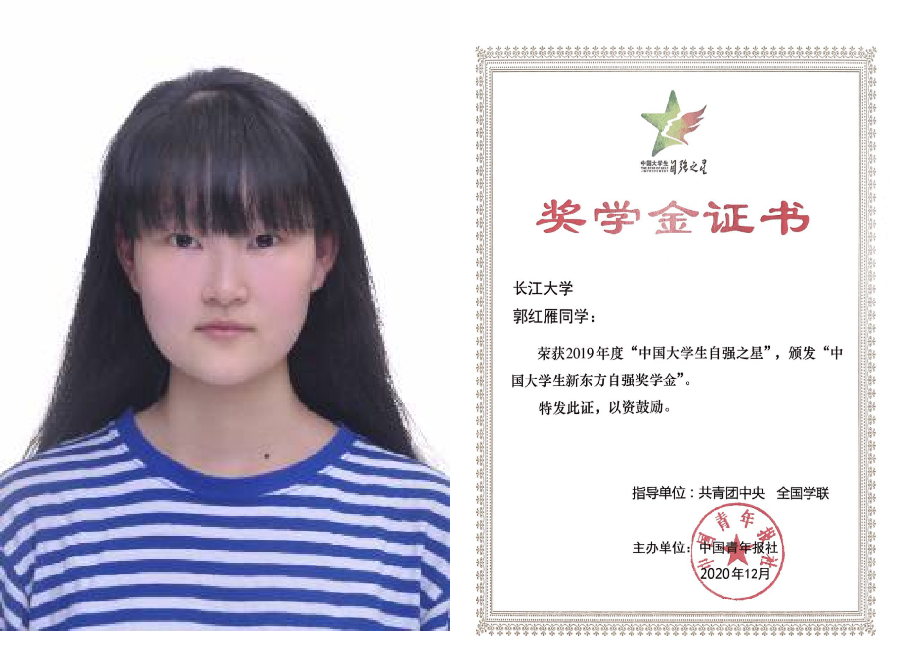 在校期间,她每天早上五点半就起床给妈妈做饭,把妈妈安顿好之后再赶去上学;放学后,她又急匆匆地赶回宿舍,为妈妈做饭、洗衣、按摩,陪妈妈说话,直到晚上才安下心来学习。她用孝心报达母亲,用勤奋书写人生。大学期间,郭红雁同学积极进取,不仅学习成绩优异,而且政治品德优良,先后被评为“荆州好人”、“太阳成集团tyc234cc十佳明星”、“湖北省向上向善好青年”、“湖北省老员工自强之星标兵”等荣誉称号,多次荣获“国家励志奖学金”、“太阳成集团tyc234cc奖学金”。2020年6月8日,她光荣地加入中国共产党,在鲜艳的党旗下向党作出了庄严承诺。