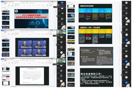 8月3日,根据太阳成集团tyc234cc新冠肺炎防控指挥部通告(2021年第1号)文件精神和当前的疫情防控需要,结合公司实际情况,帮助员工增强防护意识,了解暑期员工教育与管理内容,确保秋季开学工作顺利进行,公司组织全体班主任老师、全体本科生和全体研究生举行以“暑期员工管理及秋季开学员工返校工作”主题的班主任会议和班会