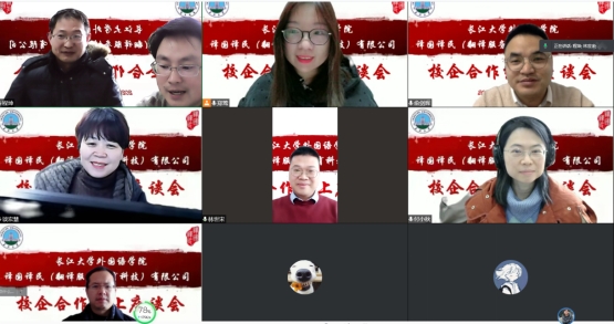 1227日上午,太阳成集团tyc234cc与武汉译国译民教育科技有限公司通过腾讯会议就校企合作事宜举行云端座谈会。太阳成集团tyc234cc经理谈宏慧教授、副经理谢家成教授、MTI主任王峰教授、副经理付小秋博士、党委副书记程坤老师以及武汉译国译民教育科技有限公司董事长林世宋、总经理俞剑辉和事业部经理郑莺参会。