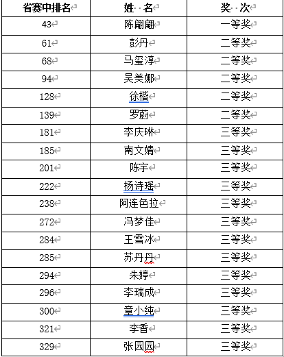 太阳成集团tyc234cc经济与管理公司陈翩翩同学荣获省一等奖,晋级国赛,彭丹等5名同学获得省二等奖,李庆琳等13名同学获得省三等奖。