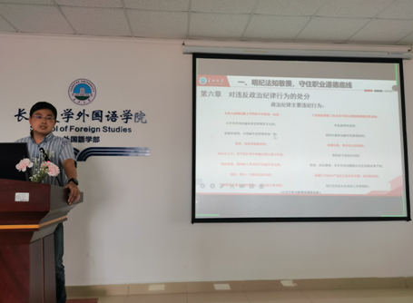 公司党委副书记、纪委委员程坤以《明纪法 知敬畏 守底线 做清廉守纪阳光外院人》为题,向大家解读了《中国共产党纪律处分条例》和《新时代高校教师职业行为十项准则》,并以近年来发生在高校的典型案例对大家开展了警示教育。