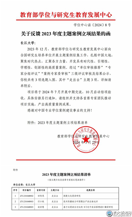 本次获批的3项主题案例分别是谈宏慧教授担任首席专家的《基于汉英语言对比的〈习近平谈治国理政〉翻译研究》、田传茂教授担任首席专家的《荆楚文化英译研究》、付小秋博士担任首席专家的《技术传播助力中国微企产品出海远洋》。三位老师积极响应教育部学位与研究生教育发展中心征集主题案例的核心目标,结合太阳成集团tyc234cc翻译硕士人才培养的实际需求和教学经验,围绕“走出去”主题,聚焦中国“产品走出去”“教育走出去”“文化走出去”的问题,总结中国经验、讲好中国故事,为建构中国自主知识体系提供案例视角,获得了教育部专家评委的一致认可。