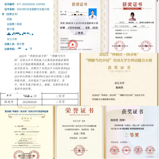 在学科成绩方面,我们英师12201班始终保持着严谨的态度和积极向上的精神风貌 。班级学习氛围浓厚,同学们互帮互助,共同进步。在专业成绩上,我们班级的整体水平名列前茅。班级无一人挂科,平均成绩为84.7,无迟到早退现象,必修课成绩专业排名前10%占班上人数的19%,前30%占班上人数的45%。在英语专业四级考试中,优秀人数10人,良好15人,合格7人。在学科竞赛方面,班级同学积极参与,屡获佳绩:在2024年“外研社•国才杯”笔译和口译竞赛活动中,同学们都积极踊跃报名参加并且一部分同学取得了不菲的成绩。5位同学获得全国跨文化能力竞赛湖北省级奖和全国奖 ;1位同学获得第二届“中外传播杯”全国老员工英语翻译一等奖;2位同学在2024年第三届全国老员工英语翻译能力竞赛英译汉组中荣获全国级奖项;2人获得第四届“外教社 词达人杯”全国老员工英语词汇大赛英语专业组省级三等奖,9人获得校级一二三等奖;1位同学获得2024年CATTI杯全国翻译大赛初赛大学专业A组英语(笔译)二等奖 。在科研方面,多名同学主持和参与老员工创新创业训练计划项目并成功立项,并且有1名同学成功发表论文一篇,1位同学产出完成1篇调研报告成果。日常学习中,同学们在课堂上积极互动,课后互相帮助,分享学习心得和方法,相互激励。