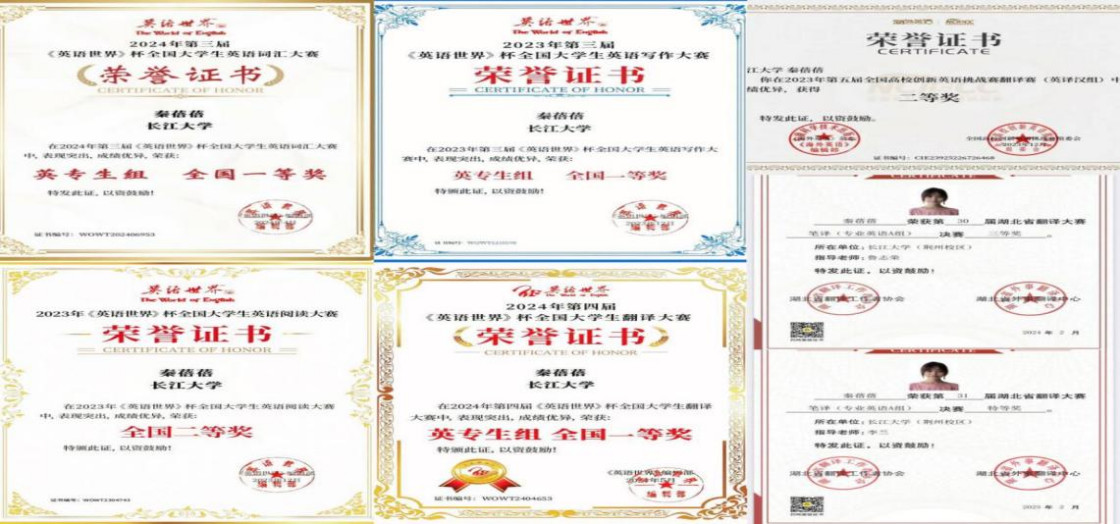 对英语学科的热爱,如同一束永不熄灭的火焰,驱使她在专业领域不断深耕。顺利通过英语四、六级考试,在英语专业四级考试中荣获优秀等级,这些成就见证了她日复一日的刻苦钻研。在各类英语竞赛的舞台上,她更是光芒四射,斩获8项国家级荣誉、2项省级荣誉以及15项校级荣誉。这些荣誉不仅是对她学术能力的高度认可,更是激励她攀登更高学术山峰的强大动力。连续两次获得国家励志奖学金,这份殊荣不仅是对她经济上的支持,更是对她拼搏精神的褒奖,让她在追求学术理想的道路上步伐更加坚定。
