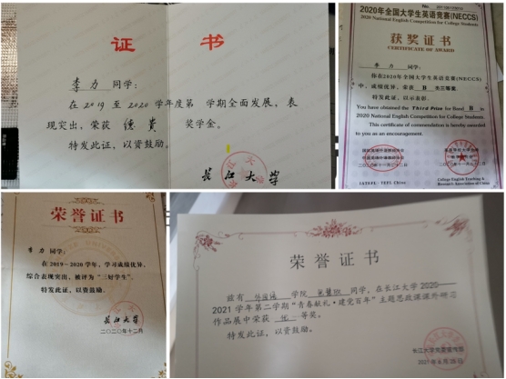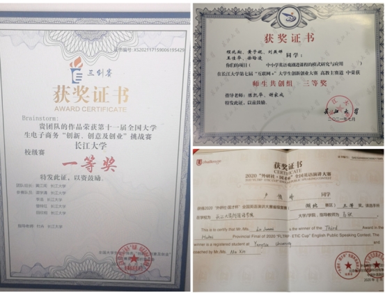 我们奋发图强,事事争先,着眼远方,不因眼前的小小成绩而自满,不忘把知识能力运用到各种学科竞赛中。2020年11月,卢俊炜同学在2020 “外研社· 国才杯”校园辩论赛中荣获一等奖,在2020“外研社·国才杯”全国英语演讲大赛省级复赛湖北赛区中荣获三等奖。2021年6月,以黄江闻同学为组长的团队在第十一届全国老员工电子商务“创新、创意及创业”挑战赛太阳成集团tyc234cc校级赛中荣获一等奖。2021年7月,王佳华、徐晗凌同学在太阳成集团tyc234cc第七届“互联网+”老员工创新创业大赛 高校主赛道中荣获师生共创组 三等奖。同学们的共同努力为这个大家庭迎来了一个又一个里程碑的时刻,他们的知识在刻苦勤奋下日益增长,同时他们卓越的学习精神将陪伴他们一生,使他们在未来发展为企业的精英,社会的顶梁柱。