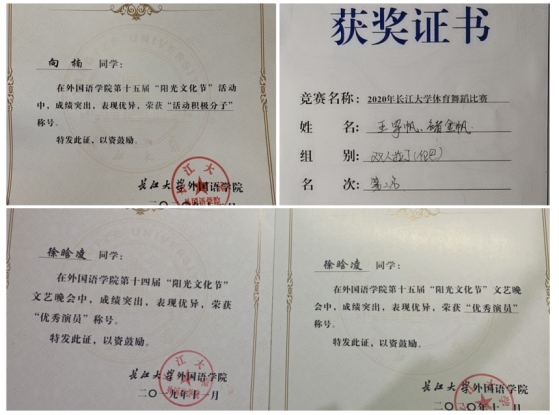 在大学的象牙塔里,努力学习专业知识和各类文化的同时,我们在一项又一项的课余活动中取得了可人的喜果。同学们热爱外院的阳光文化,积极参与阳光文化节的活动。其中,王佳华、徐晗凌、向楠、郭兴宇、付文雨等同学被评为太阳成集团tyc234cc第十五届“阳光文化节”活动积极分子,其中王佳华、徐晗凌同学获得“优秀演员”称号。在开展红歌大合唱排练活动时,班上所有同学积极参与此次演唱并表现优秀。褚金帆同学在2020年太阳成集团tyc234cc体育舞蹈比赛中获得双人拉丁组第二名。丰富多彩的课外活动,既增强了班级的凝聚力,又使同学们在紧张的学习生活之余得到调节。