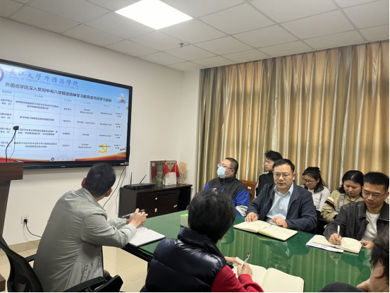 经理谈宏慧结合当前全国大学外语教学改革方向,对教师党支部作风建设提出建议,要加强调查研究工作,互学互鉴教学经验,用好《理解当代中国》教材,大力推动思政元素融入课堂教学。