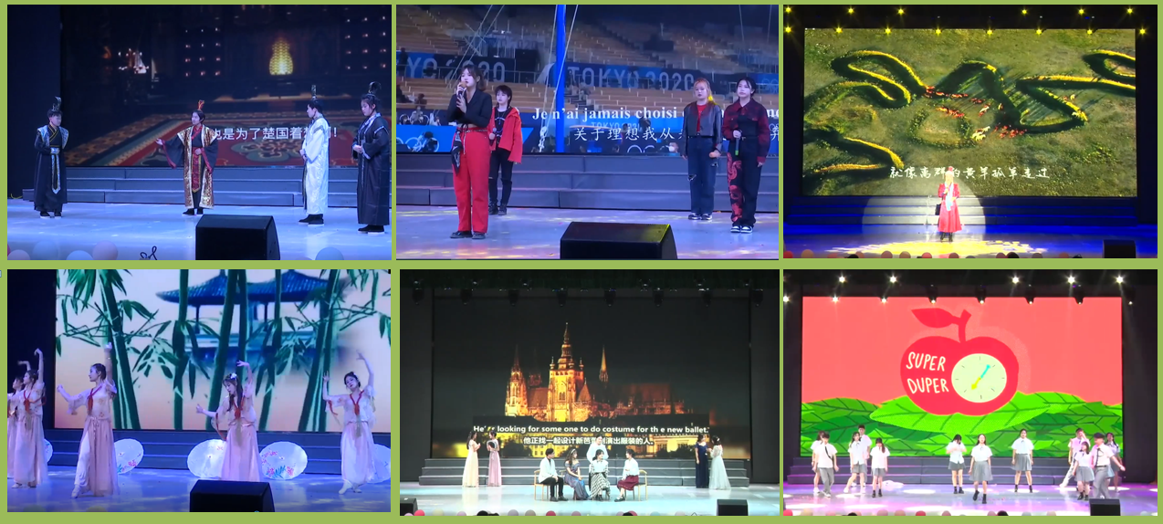 闭幕式文艺汇演在精彩的舞蹈中开场。分为“盛世华章,继往开来,初心难忘谱新曲”“激扬青春,强国有我,英姿奋发正当时”两个篇章。整台晚会彰显特色、突出专业、精彩纷呈,线上观众热情高涨。汉语、英语、日语、俄语、法语5个语种演唱的歌曲《追梦赤子心》,带领观众领略不同语言的魅力;笛萧合奏《无羁》,古风古韵,回味无穷;外文剧团呈现的经典剧作《Midnight in Poris(午夜巴黎)》,地道的英语、绅士且高雅的表演、华丽的场景深深打动着观众们的心;日语配音节目《辉夜姬大小姐》、教师韩艳丽博士倾情演唱的蒙语歌曲《忘不了》等节目全面展示了不同语言的文化底蕴与特色……公司师生用丰富的艺术形式展现多彩校园文化生活。颁奖晚会在合唱《光荣啊,中国共青团》中圆满落幕。