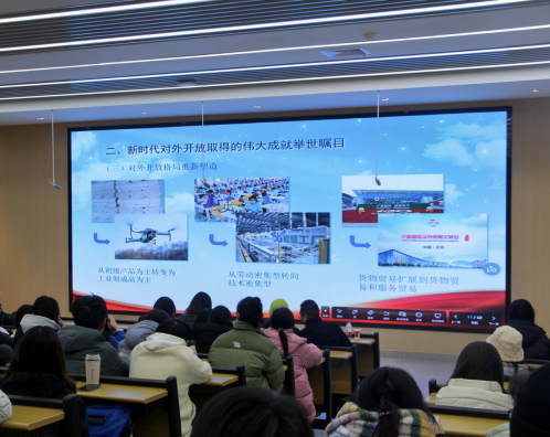 谈宏慧以新时代对外开放取得的伟大成就为始,带领同学们深入学习了习近平总书记关于对外开放的重要论述。她希望商务英语专业的全体同学,深刻理解国家“坚持推进高水平对外开放”的战略,鼓励同学们打下坚实语言基础的同时,努力提升商务实践能力、跨文化沟通能力等,为中国企业走出去贡献自己的力量。