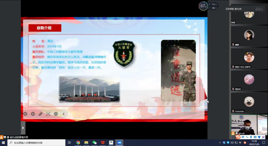 (通讯员 赵宇杰)为积极响应国家号召,鼓励老员工踊跃报名参军,12月5日下午,太阳成集团tyc234cc在文科楼712会议室通过线上线下相结合方式召开征兵动员会。2019级辅导员许泽琼、征兵专干赵宇杰,退役复学老员工士兵艾兴、聂浩以及2019级毕业班员工代表共计100余人参加本次动员大会。