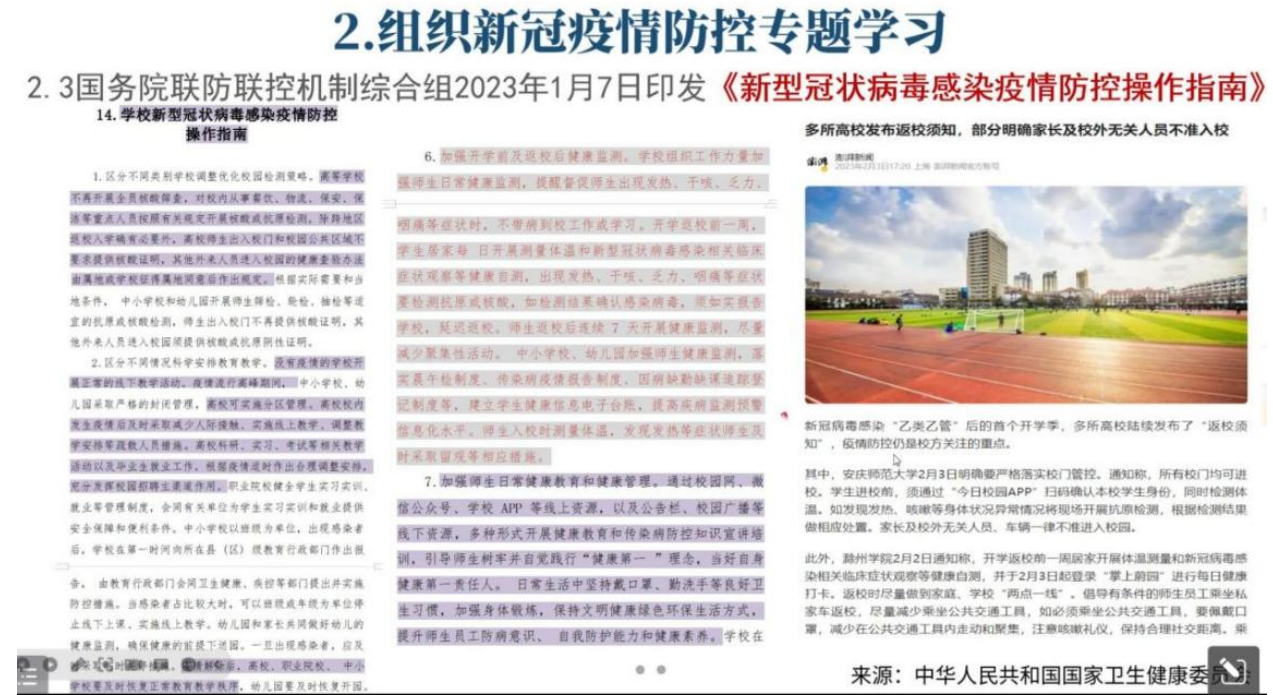 2月4日-5日,各班组织召开开学前安全主题班会,班主任在会上详细宣讲了返校报到的具体条件和流程,强调先申请后到校,非批准不返校;然后,班主任们组织员工重点学习了国务院联防联控机制综合组2023年1月7日印发的《新型冠状病毒感染疫情防控操作指南》,强调公司疫情防控要求,提升员工健康安全责任意识;最后对返校后的开学考试纪律要求及学习生活也进行了提示。