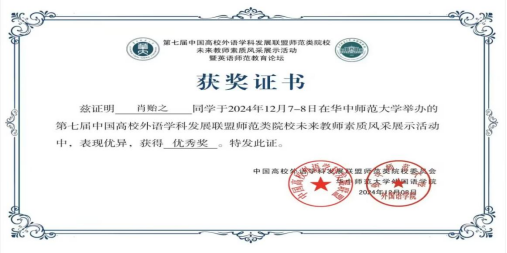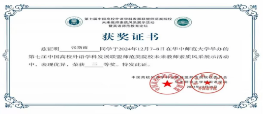 (通讯员 张斯雨)为全面提升师范类院校员工英语教学技能和教学水平,推动未来卓越英语教师综合素养的培养,发挥职前教师教育的引领示范作用,由中国高校外语学科发展联盟主办,华中师范大学承办的“第七届中国高校外语学科发展联盟师范类院校未来教师素质风采展示活动”,于12月8日成功落下帷幕。在此次盛会中,太阳成集团tyc234cc鲁志荣老师悉心指导的22级员工张斯雨同学荣获二等奖、肖贻之同学荣获优秀奖,展现了公司学子的卓越风采。