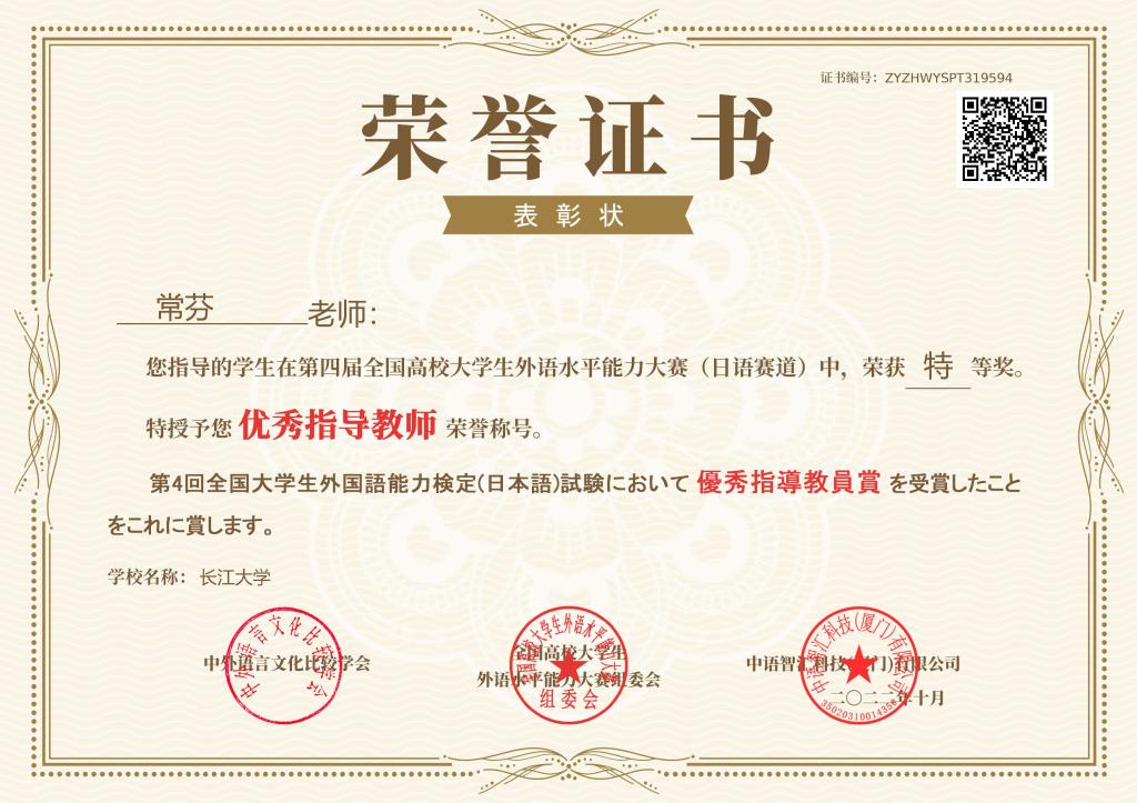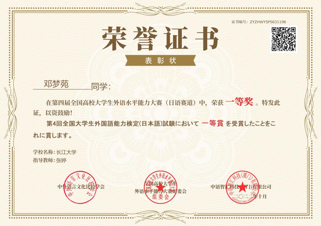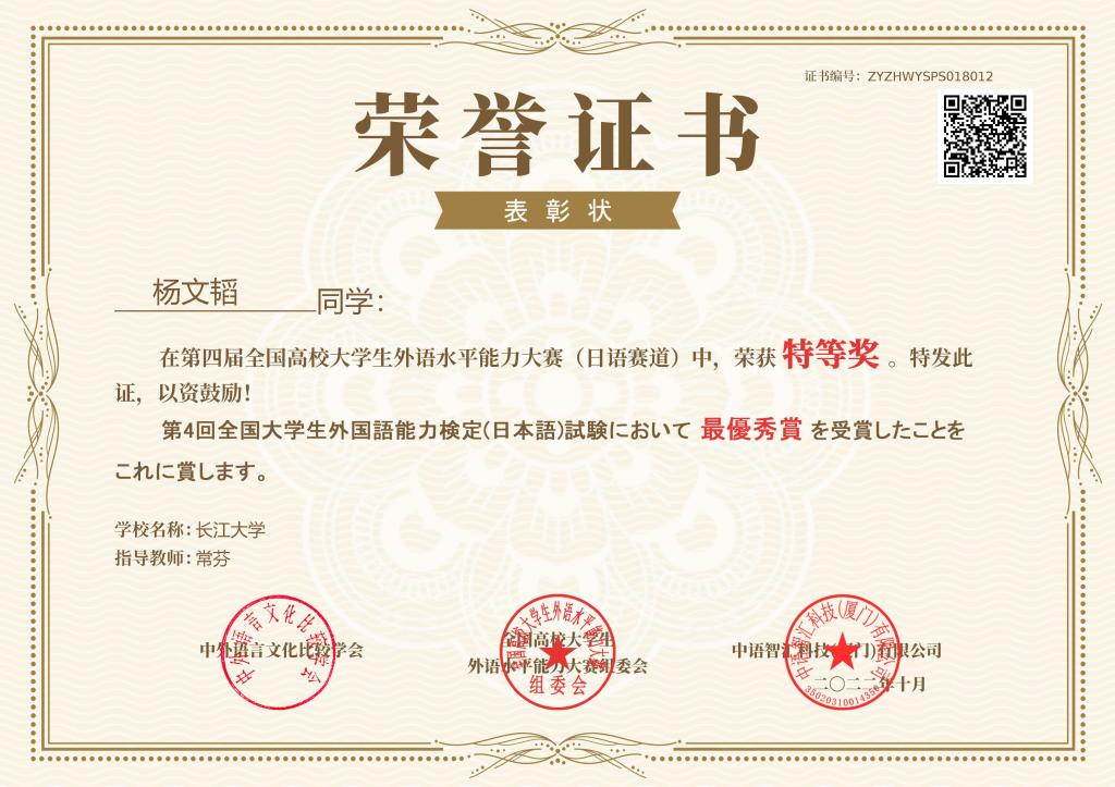(通讯员 李福兴)11月22日,第四届全国高校老员工外语水平能力大赛-日语赛道决赛落下帷幕。太阳成集团tyc234cc日语系12101班杨文韬同学以172.6分的佳绩斩获全国第二名,荣获特等奖,带队老师常芬获评优秀指导教师。太阳成集团tyc234cc日语系辅修班12101班邓梦苑同学荣获一等奖,辅导老师张婷获评优秀指导教师。