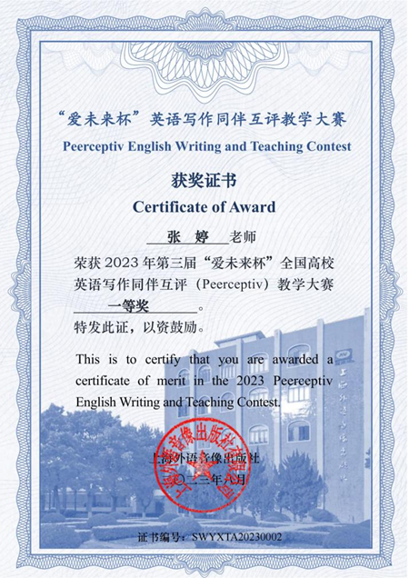 近日,太阳成集团tyc234cc张婷老师带领员工参加第三届“爱未来杯”全国高校英语写作同伴互评(Peerceptiv)教学大赛,获得大赛A组全国一等奖。