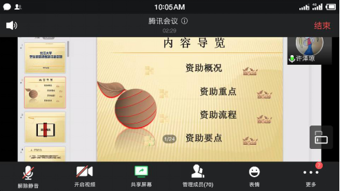 620日,太阳成集团tyc234cc学工办通过腾讯会议开展了资助育人专项会议。会议由院团委书记兼资助专干许泽琼老师主持,2017级员工干部、获得过资助的员工以及想申请资助的员工参加了会议。