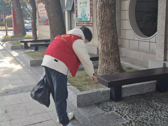 下午1点,活动正式开始。志愿者们在博物馆广场及人行道,他们仔细捡拾烟头、纸屑等垃圾,确保路面干净整洁。使用垃圾夹仔细清理隐藏在灌木丛中的塑料瓶、食品包装等废弃物。同时擦拭公共座椅、垃圾桶等公共设施,他们用湿布擦拭,确保设施表面无尘无垢。