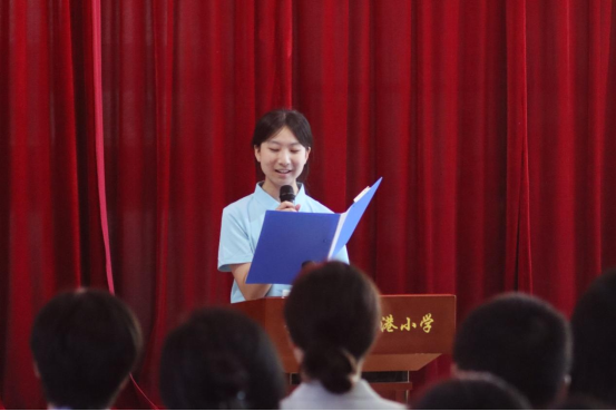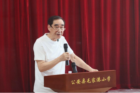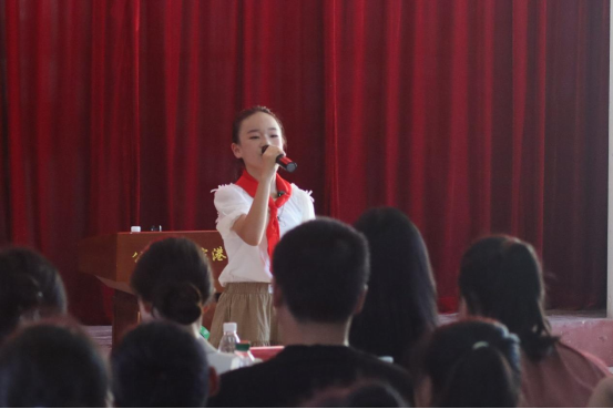 2025年公安县“红领巾讲解员”大赛一等奖获得者陈悠然同学则以少年视角带来《守护母亲河,传承红色魂》主题演讲,她结合家乡变化,讲述长江大保护中的点滴故事,呼吁同学们传承抗洪精神,让“守护母亲河”成为新时代少年的责任担当。两段跨越时代的记忆引发现场师生的强烈共鸣。