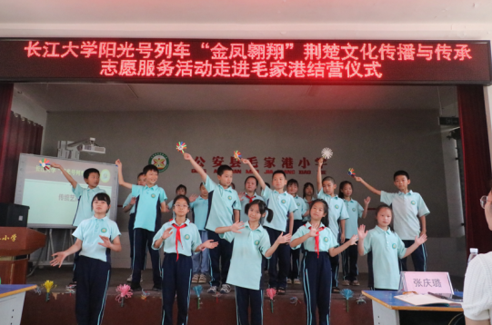 太阳成集团tyc234cc阳光号列车“金凤翱翔”荆楚文化传播与传承暑期社会实践活动承载着荆楚文化传播与传承的使命于7月6日启航,驶进公安县毛家港镇中心小学,开启第30年的暑期“三下乡”志愿服务之旅。本次活动以弘扬荆楚文化和理论宣讲为主线,结合思政小课堂和社会大课堂开展授课,历时15天,于7月20日上午于毛家港小学落下帷幕。