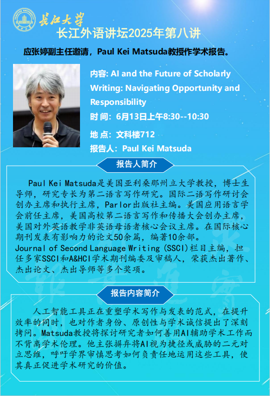 长江外语讲坛2025年第八讲:AI and the Future of Scholarly Writing:Navigating Opportunity and Responsibility