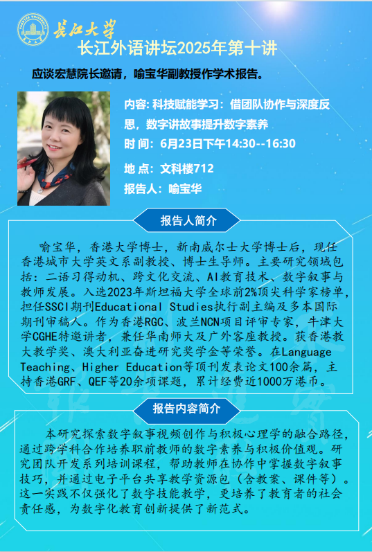 长江外语讲坛2025年第十讲:科技赋能学习:借团队协作与深度反思,数字讲故事提升数字素养