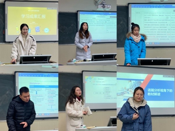 活动伊始,刘燕婵同学就本学期的课程内容做了简要介绍后,又进一步谈到自己在课程中的收获,如将课程与核心素养目标相结合,对教案和教学设计的区分等,并通过对比的方式直观的展示了自己开学以来的学习成果,最后在自我反思中,刘燕婵同学提到教学评价等方面自己存在的不足,她表示将在以后的学习中提高。随后,马娟,郭媛梦和黄秋阳同学,分别借助三篇教材文本” The Theme Park”, “Do you like bananas?”,” Nelson Mandela”,向同学们清晰的呈现了自己在英语教学理论与实践,英语课程与教材研究以及语篇分析与外语教学等课中的学习成果与实践应用能力。接着,张杰和袁丹丹同学将自己的教学经验与本学期所学内容相结合,展示了自己对语篇分析视角下的教材解读及应用的理解。